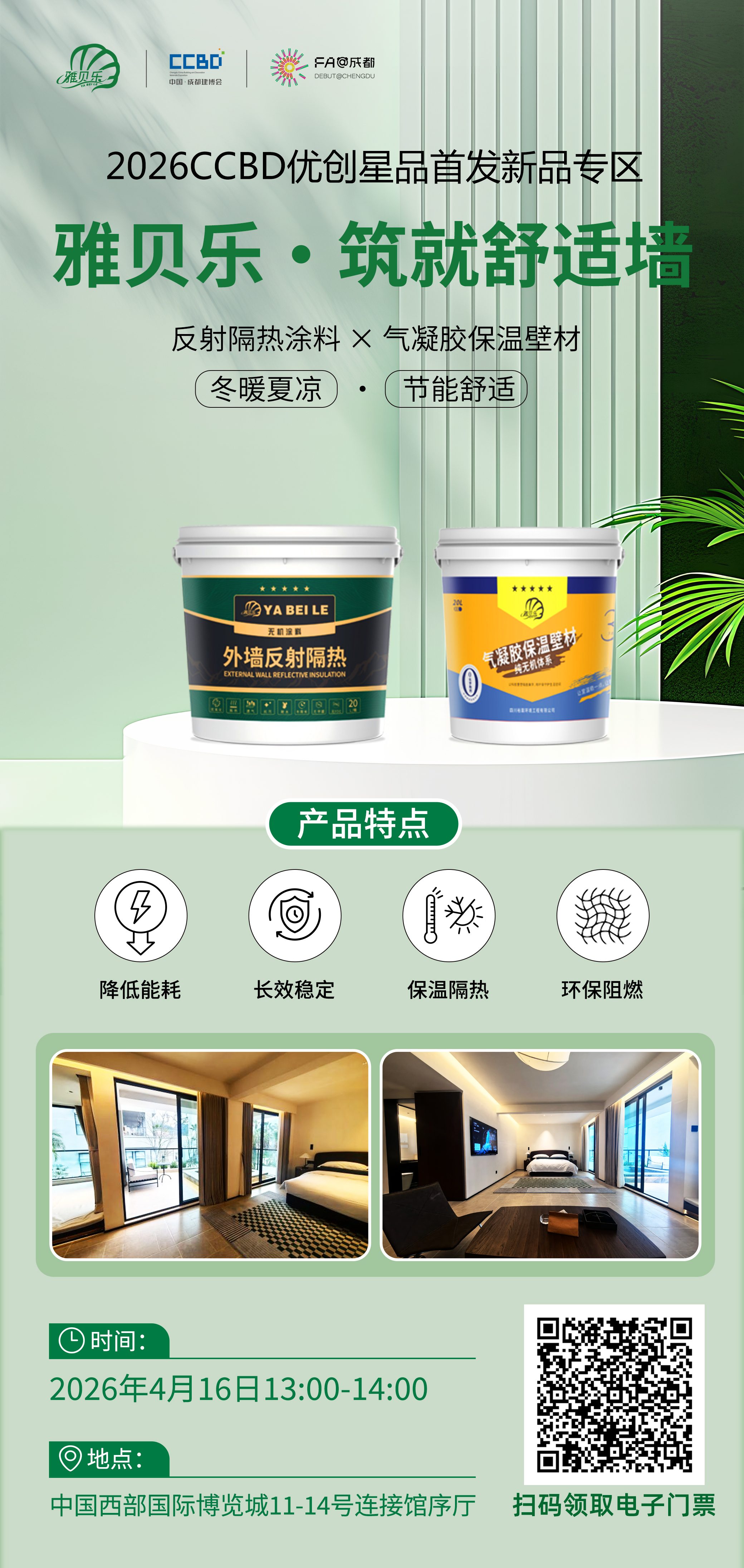 2026CCBD 中国・成都建博会优创星品首发新品专区,雅贝乐携两大核心力作 ——反射隔热涂料与气凝胶保温壁材重磅登场,以「冬暖夏凉、节能舒适」为核心,重新定义建筑墙面的舒适与节能标准!无惧夏日高温炙烤,这款无机涂料通过高效太阳热反射技术,将太阳辐射热量阻隔在建筑之外,大幅降低墙面与室内温度,减少空调能耗,让建筑自带「清凉 buff」,从源头实现节能降耗。攻克传统保温材料的性能瓶颈,以气凝胶的超优保温性能,为建筑打造高效保温层,冬季牢牢锁住室内热量,告别阴冷潮湿,同时纯无机体系更安全、更耐用。✅ 降低能耗:双产品协同作用,大幅减少建筑冷热负荷,降低空调、采暖能耗,助力建筑绿色低碳升级✅ 长效稳定:耐候性拉满,长期使用性能不衰减,为建筑提供持久可靠的保温隔热保障✅ 保温隔热:双向控温,夏季隔热、冬季保温,全方位提升居住舒适度✅ 环保阻燃:无机环保配方,无有害物质释放,同时具备优异阻燃性能,安全更安心时间:2026 年 4 月 16 日 13:00-14:00新品发布会地点:中国西部国际博览城 11-14 号连接馆序厅雅贝乐始终以「打造舒适节能的建筑空间」为使命,本次首发的两大新品,是我们在无机建材领域的又一次技术突破。无论是住宅、商业建筑还是工业项目,都能通过这套墙面系统,实现节能与舒适的双重升级。4 月 16 日,成都建博会,我们在优创星品首发专区,等您共探建筑节能新未来!